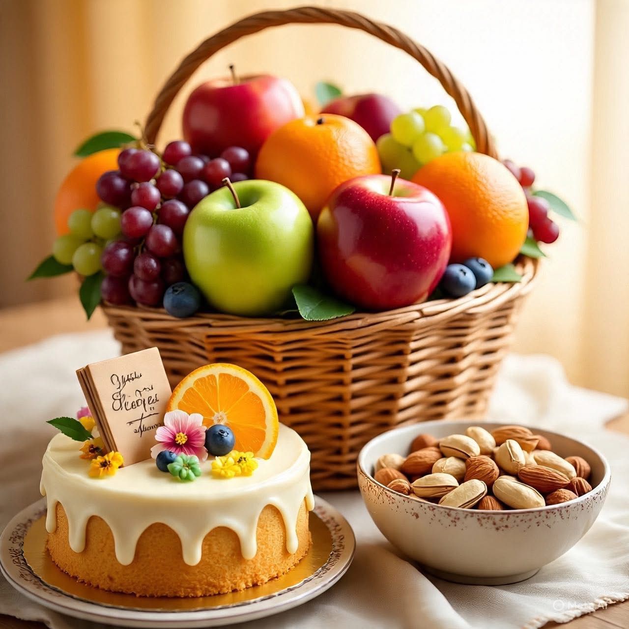 A thoughtful gift combo featuring a stunning bouquet of fresh pink roses arranged beautifully in a glass vase, paired with a healthy assortment of seasonal fruits including bananas, apples, pomegranates, oranges, pineapple, and pear, all elegantly presented in a wicker basket. To add a personal touch, the set includes a special greeting card with the heartfelt message “Love You Mom,” making it an ideal gift for Mother’s Day, birthdays, or to simply show love and care. 1 pound cake. 5 kgs fruits 2 pack nuts ( almond and cahews) 200gm each.